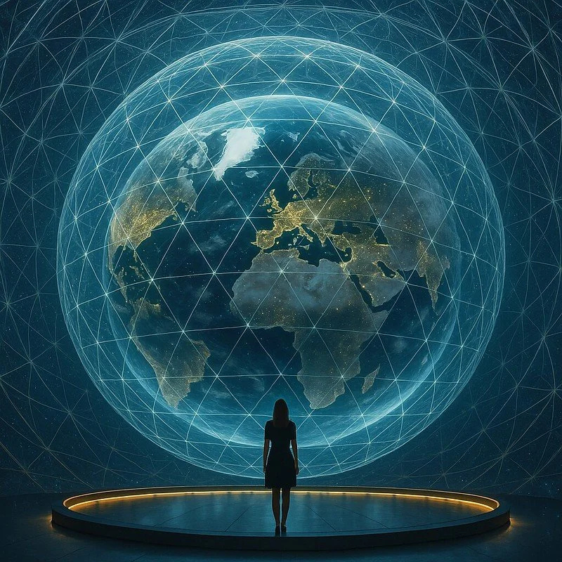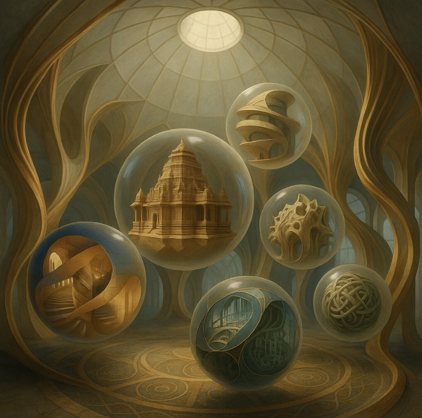Here, 24 spheres of the world’s great libraries gather into a single cosmic architecture. Each retains its individuality – papyrus scrolls, Byzantine manuscripts, crystalline domes – yet together they harmonize into a constellation of human knowledge throughout millennia. The domed architecture itself is timeless, part Byzantine basilica, part futuristic observatory, its glass geodesic dome of light spanning all eras at once. This is a cathedral of memory, where past, present, and future coalesce into one great continuum.
